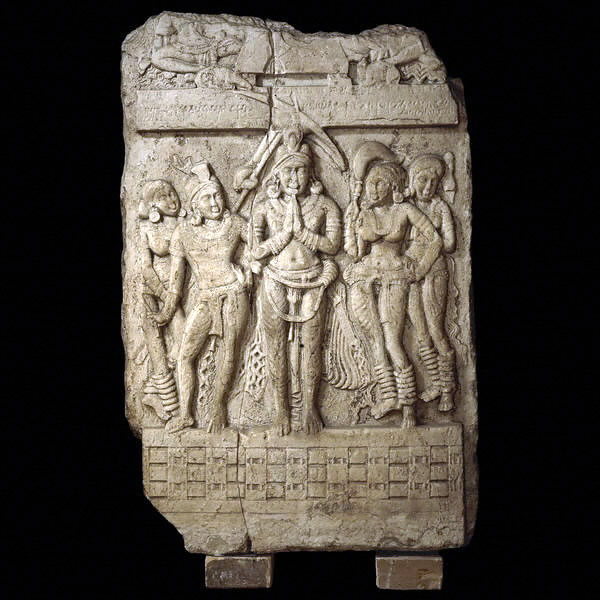 Известняковая панель с изображением чакравартина с купола ступы в Амаравати, Андхра-Прадеш, Индия, 2 в. н.э.
