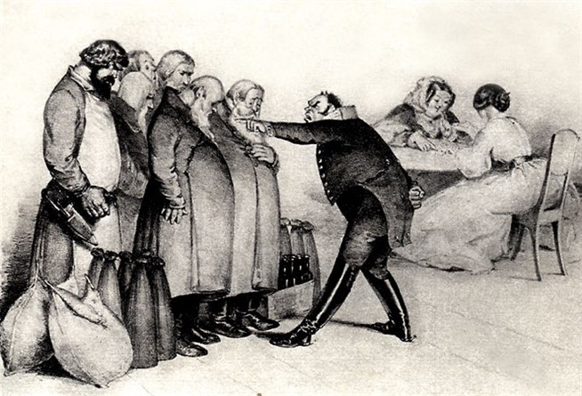 Иллюстрация к комедии «Ревизор» (Катехиз бюрократа). Автолитография П.М. Боклевского.