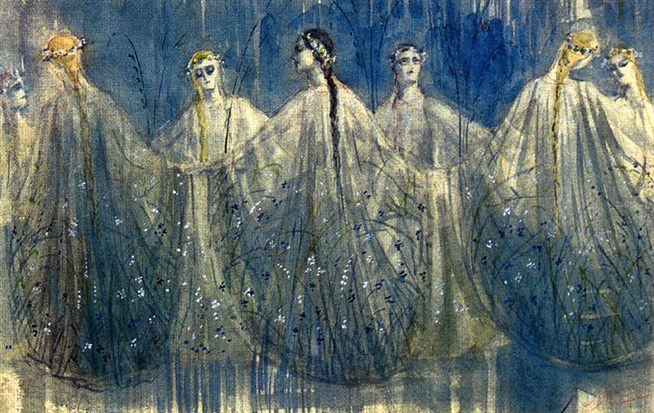 Эскиз декораций к опере Н.А. Римского-Корсакова «Майская ночь или Утопленница» по одноименной повести Н.В. Гоголя. Художник А.М. Мазанов.