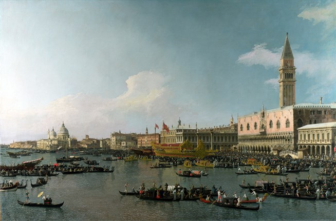 Каналетто. Венеция: Лагуна у Сан-Марко в день Вознесения. Около 1740 года. Холст, масло. Национальная галерея, Лондон. В русскоязычной литературе эта картина известна как «Отплытие «Буцентавра» от мола в день Вознесения». Каждый год в день Вознесения дож совершал обряд обручения Венеции с морем. На корабле «Буцентавр» он выходил в открытое море и бросал в него кольцо.