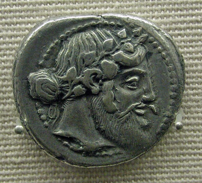 Монета с изображением головы Диониса — бога вина. Серебро. Диаметр 29 мм. Наксос. Греция. 460 г. до н.э.