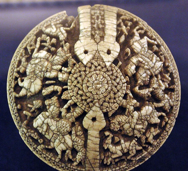 Крышка коробочки (вероятно для духов), украшенная фигурами четырех охотников, убивающих оленей и леопардов, с именем ее владельца — визиря Абу Мутарифа, одного из последних членов династии испанских Омейядов. Вырезанная слоновая кость. Диаметр 10, 5 см. Кордова (?). Испания. 999 г.