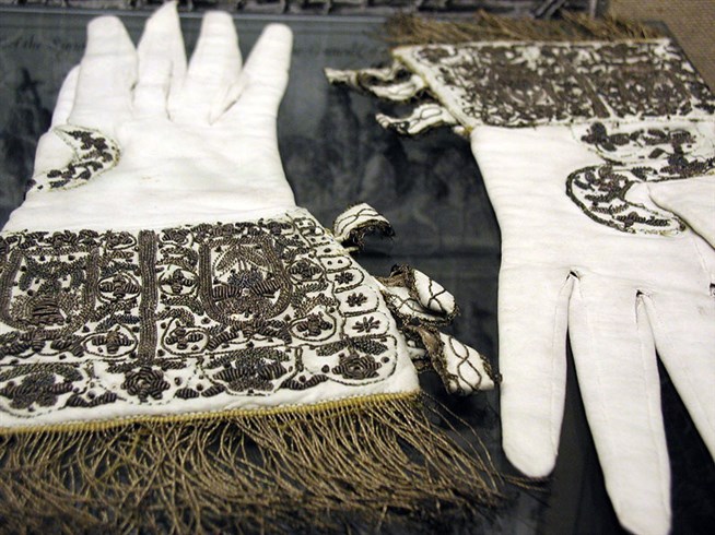 Перчатки, подаренные королеве Елизавете I в 1566 по обычаю того времени во время ее визита в Оксфорд. Вероятно, большой размер перчаток заставил королеву оставить их, несмотря на прекрасную отделку. Вудсток (?). Англия.