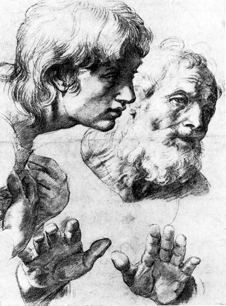 Рафаэль. Эскиз «Головы двух апостолов и кисти их рук» к полотну «Преображение». 1517.