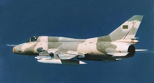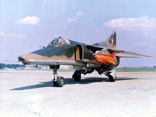 Истребитель-бомбардировщик МИГ-27. Создан на базе фронтового истребителя МиГ-23. Предназначен для нанесения ударов по неподвижным наземным целям в тылу противника в светлое время суток, а также штурмовых действий с использованием пушек, управляемых ракет, неуправляемых авиационных ракет и свободнопадающих бомб.