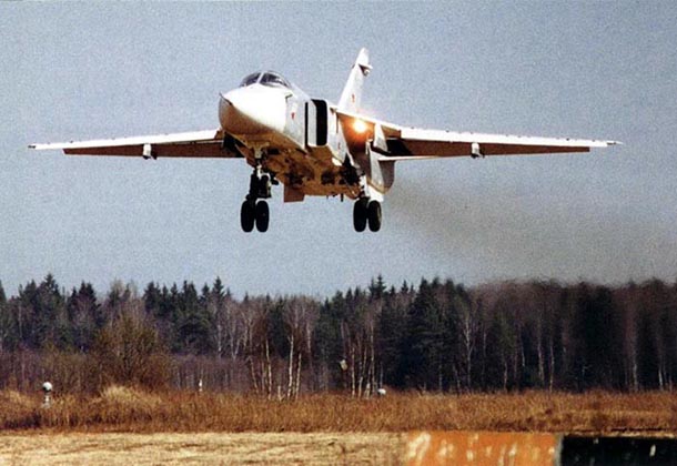 Фронтовой бомбардировщик СУ-24. Су-24 - один из наиболее массовых боевых самолетов современных российских ВВС. Су-24 стал вторым, после МиГ-25РБ, отечественным тактическим самолетом, оснащенным цифровым прицельно-навигационным комплексом (ПрНК). Су-24М - первый отечественный тактический самолет, оснащенный системой дозаправки топливом в полете. Убирающийся топливоприемник размещен перед фонарем кабины летчиков.