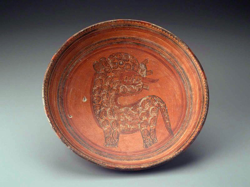 Керамическая тарелка. Майя, классический период, 500-650 гг. Мехико. На тарелке изображен рычащий ягуар.