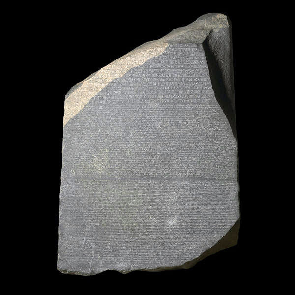 Розетский камень — базальтовая плита с параллельными текстами на греческом и древнегреческом языках. Расшифровка этих текстов положила начало чтению древнеегипетских иероглифов. Древний Египет, 196 г. до н.э.