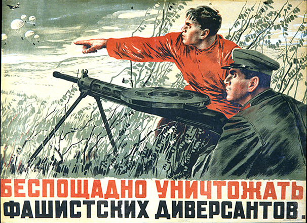 Беспощадно уничтожать фашистских диверсантов. Плакат П. Мальцева. 1941 год.