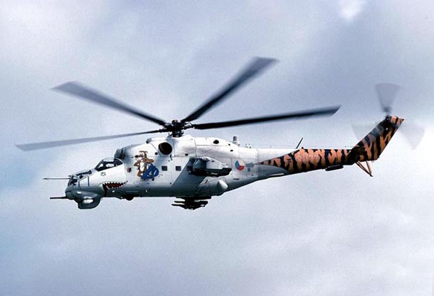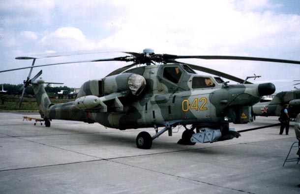 Ми-24П - многоцелевой ударный вертолет, «летающая боевая машина пехоты». Разработан в КБ Миля. Явлется пушечным вариантом вертолета Ми-24 («П» означает «пушка»), аналогом Ми-24В, но с неподвижно установленной с правого борта двухствольной пушкой ГШ-30-2 (два длинных ствола с коническими насадками на концах). Пулемет и его прицельный комплекс сняты, поскольку прицеливание осуществляется самим вертолетом.
