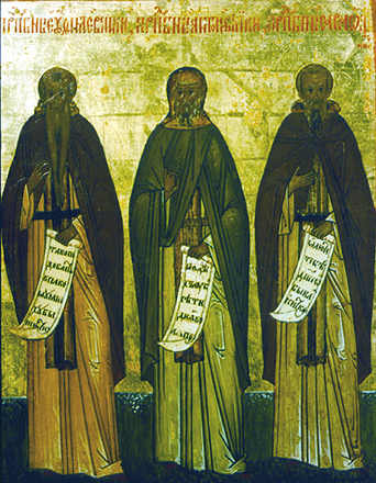 Владимиро-суздальская школа. Евфимий Великий, Антоний Великий, Савва Освященный. Икона из Рождественского собора в Суздале. 16 век. Собрание Владимиро-суздальского музея-заповедника.