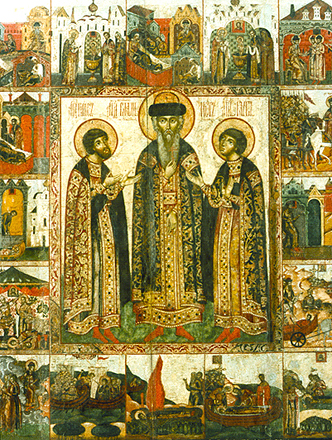 Владимиро-суздальская школа. Князь Владимир с сыновьями Борисом и Глебом. 17 век. Собрание Владимиро-суздальского музея-заповедника.