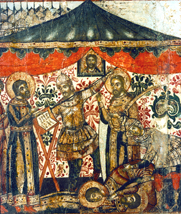 Владимиро-суздальская школа. Убиение князя Бориса. Клеймо иконы «Князь Владимир с сыновьями Борисом и Глебом». 17 век. Собрание Владимиро-суздальского музея-заповедника. На фоне узорчатого шатра происходит действие нескольких разновременных событий — молитва перед образом Спаса, проникновение убийц в шатер, попытка слуги спасти князя, убийство Бориса.