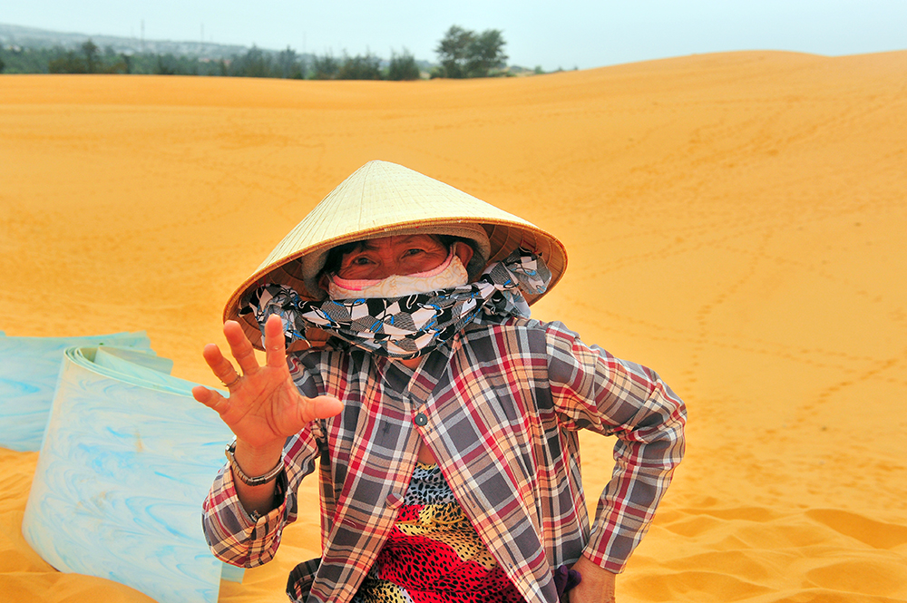 Пожилая вьетнамка зарабатывает на прокате пластиковых клеенок, которые дает туристам для специфического веселья — спуска по песчаным дюнам. 2014 год. Фото Руслана Булатова