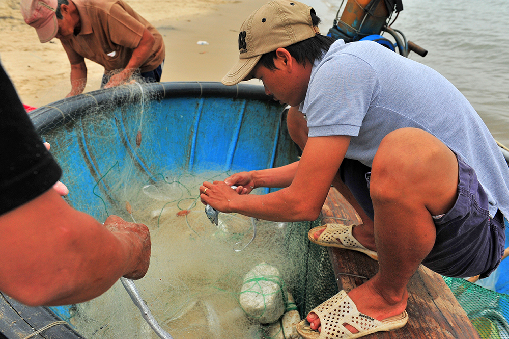 Рыбаки распутывают сети, собирая редкий улов. Рыбацкая деревня у побережья маяка Кега. Вьетнам. 2014 год. Фото Руслана Булатова