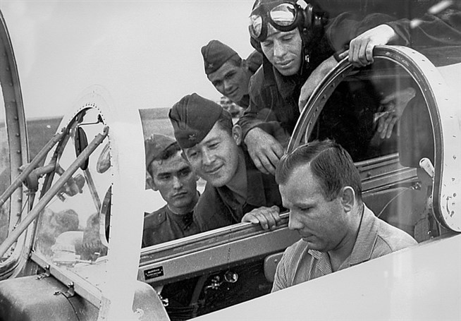 Оренбург. Оренбургское военное авиационное училище летчиков. Юрий Гагарин в кабине учебного реактивного самолета «Л-29». 9 августа 1965 года. Фотохроника ИТАР-ТАСС.