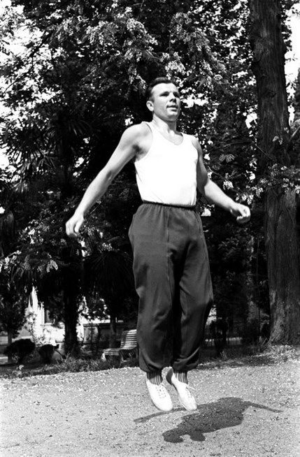 Юрий Гагарин во время утренней зарядки. Прыжки. 1961 год. Снимок А. Сергеева. Фотохроника ИТАР-ТАСС.