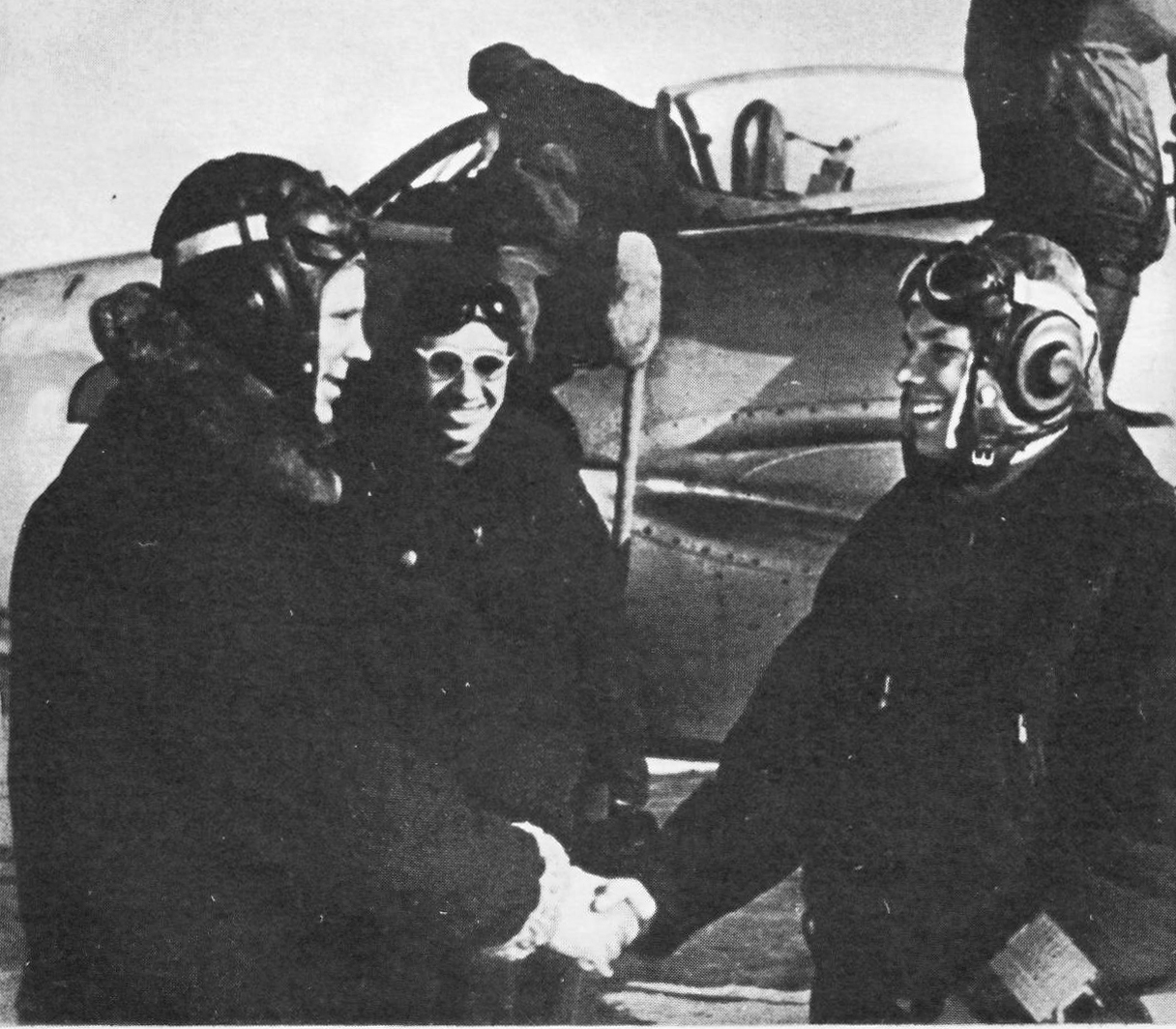 Командир эскадрильи поздравляет Юрия Гагарина с первым самостоятельны полетом. 6 апреля 1958 года.