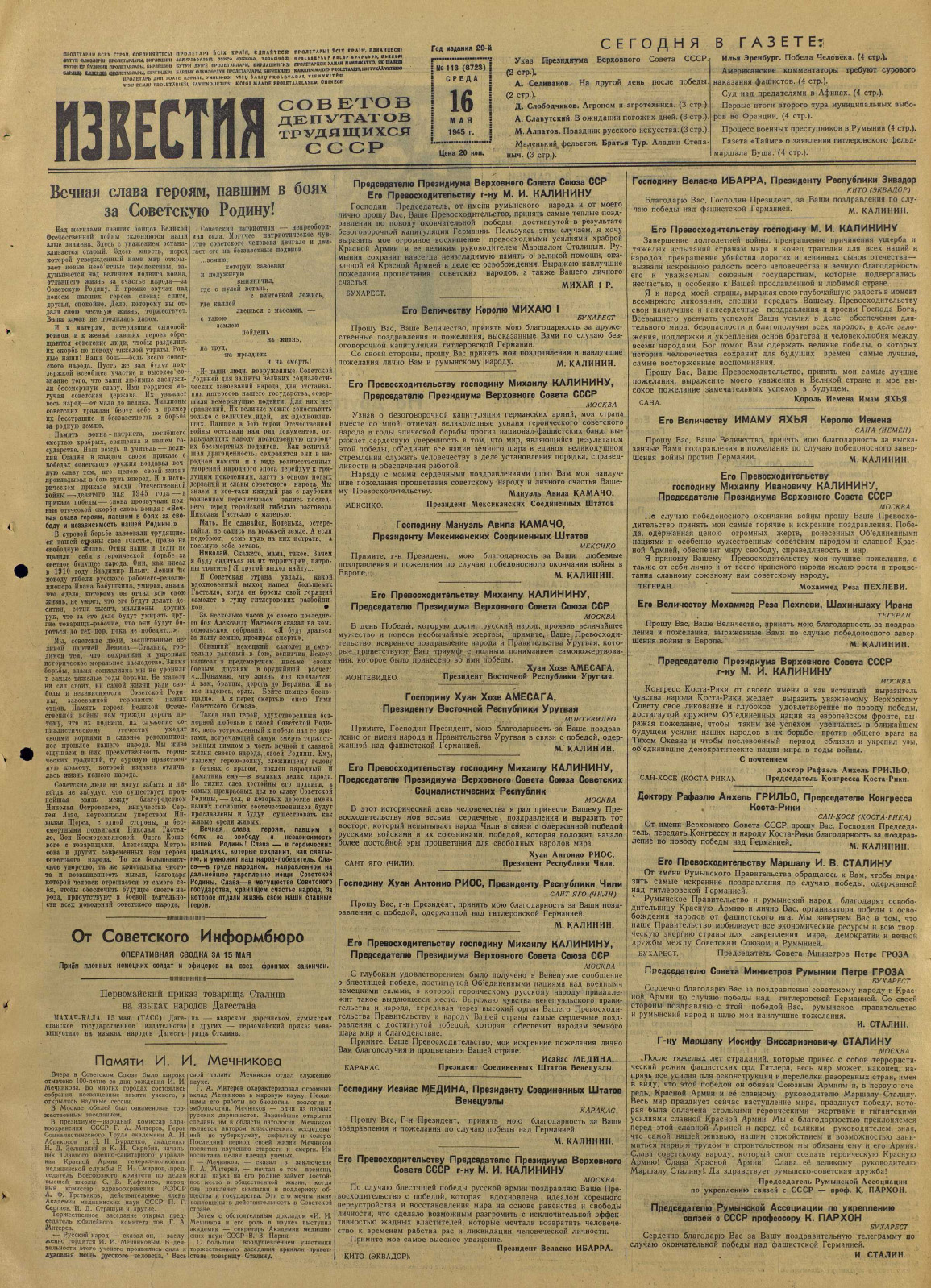Газета «Известия» №113 от 16 мая 1945 года (страница 1)