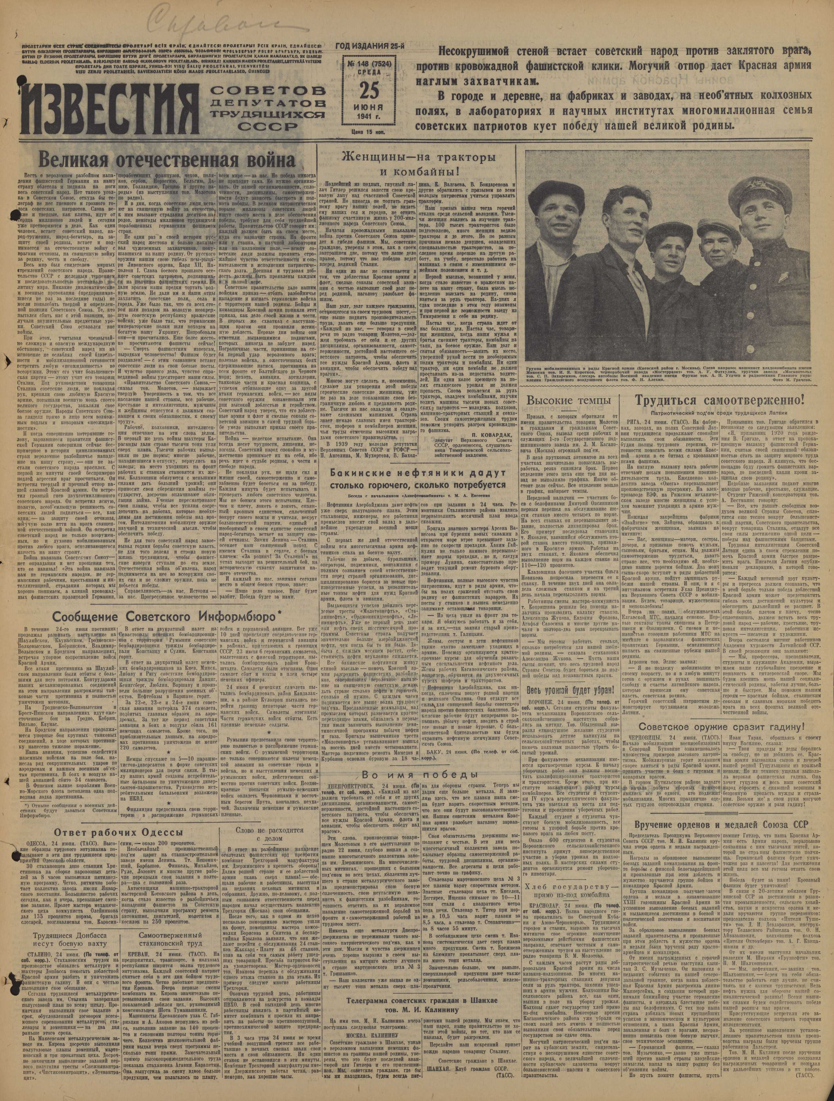 Газета «Известия» от 25 июня 1941 года