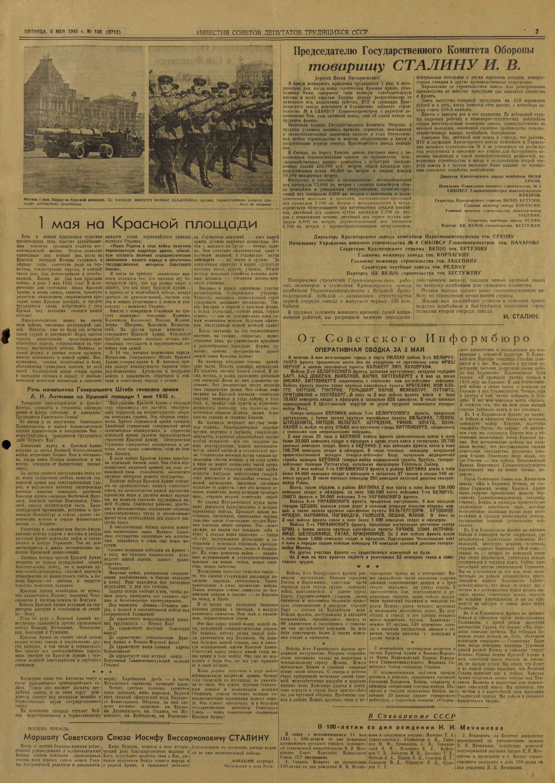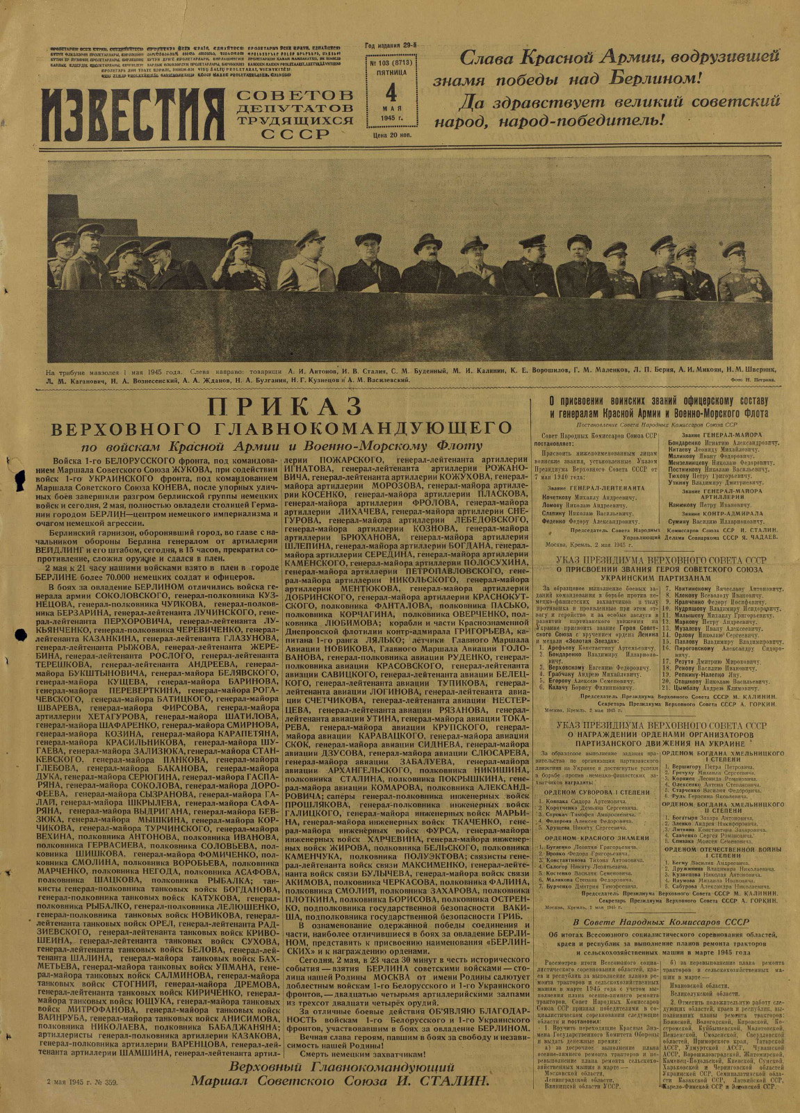 Газета «Известия» №103 от 04 мая 1945 года (страница 1)