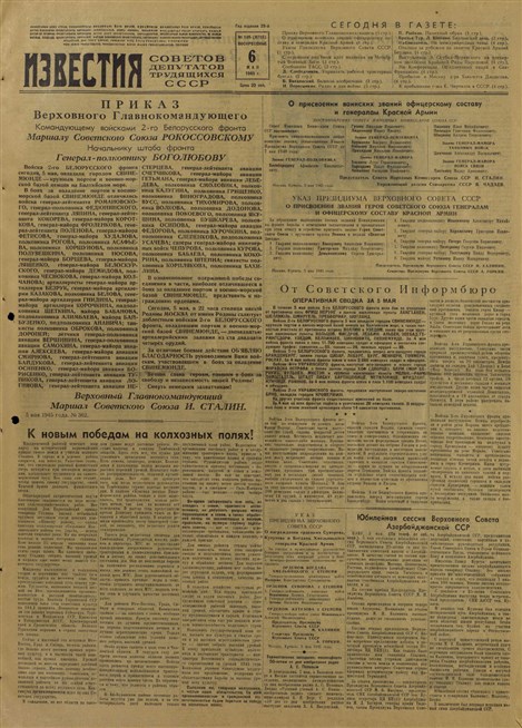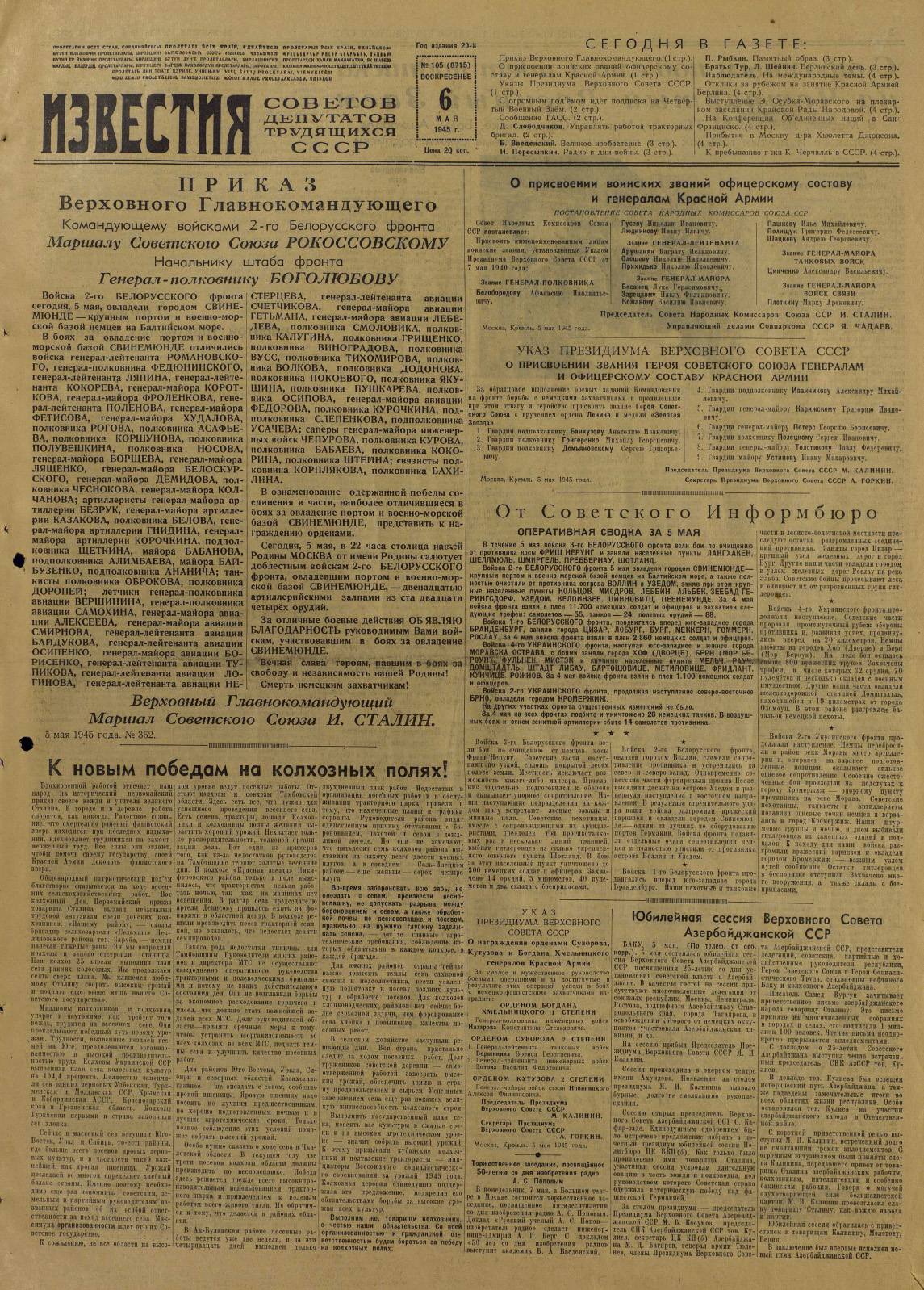 Газета «Известия» №105 от 06 мая 1945 года (страница 1)