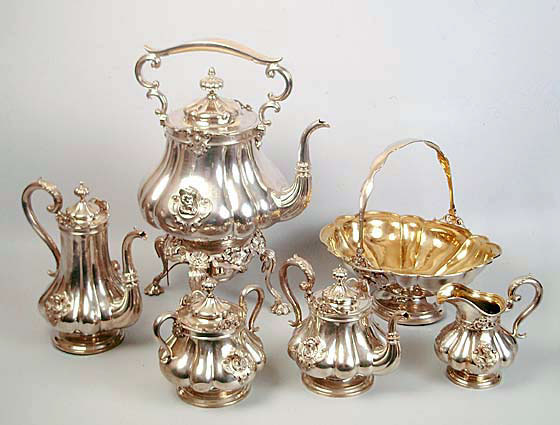 Чайно-кофейный сервиз. Москва, 1847 г. Фирма И. Сазикова (7 предметов). Серебро, позолота, слоновая кость.