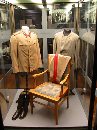 Личные вещи И. В. Сталина: повседневный китель Маршала Советского Союза, брюки-галифе к кителю Маршала Советского Союза, сапоги, домашний мужской халат, кресло с дачи И. В. Сталина в Волынском.