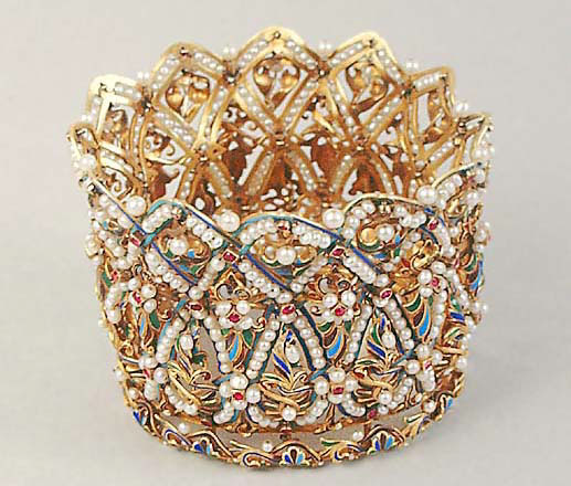 Браслет-манжет. Москва, 1880-е (?). Мастерская И. Д. Чичелева. Золото, эмаль, рубины, жемчуг.