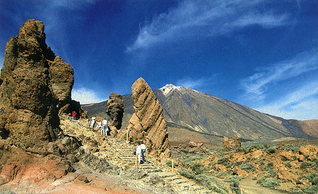 Скалы Синчадо. Виден вулкан Тейде – высочайшая вершина Испании, высота 3718 м. Остров Тенерифе (Канарские острова).