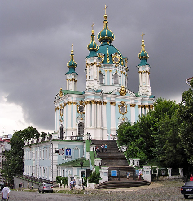 Киев. Андреевская церковь. Построена по проекту В. В. Растрелли, архитектор И. Ф. Мичурин (1748-1767). Была заложена императрицей Елизаветой Петровной в 1744 в знак благодарности судьбе, даровавшей ей мужа Олексу Розума (будущего графа Разумовского). По преданию, Андрей Первозванный, побывав на днепровских кручах, воздвиг здесь крест и предсказал Киеву большое будущее (отсюда название). Фото Е. В. Федоровой.