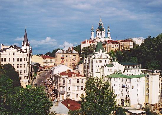 Киев. Панорама Андреевского спуска. На заднем плане: купола Андреевской церкви. Андреевский спуск был когда-то кратчайшим путем из Верхнего города на Подол. Ныне воссозданный в старинном стиле Спуск представляет место выставки-продажи живописи и изделий народного творчества. Одной из главных достопримечательностей улицы является дом № 13, в котором провел детство и студенческие годы автор знаменитого романа «Мастер и Маргарита» Михаил Булгаков.