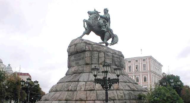 Киев. Памятник Богдану Хмельницкому на Софиевской площади. Правой рукой с гетманской булавой Богдан Хмельницкий указывает на север, в сторону Москвы. 1879-1888. Скульптор М. Микешин, архитектор В. Николаев.