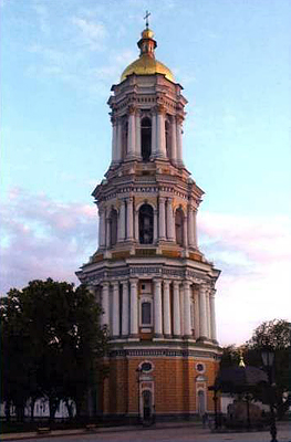 Киев. Михайловский Златоверхий собор с колокольней (1108-1113). Образец шестистолпного, крестово-купольного, трехнефного храма. Построен так же, как и Софийский собор, смешанной кладкой с характерным чередованием камня и кирпича. Фасады завершаются арками-закомарами, декорированы плоскими лопатками; барабан центрального купола украшен меандровым фризом и большим числом плоских ниш. Кровли куполов позолочены (отсюда название). Интерьер собора оформлен уникальными фресками и мозаиками. Среди них: мозаичная композиция «Евхаристия», мозаика «Дмитрий Солунский», фрески «святитель Николай», «первосвященник Захария», «Благовещение». В годы советской власти собор был разобран, фрески и мозаики были переданы частично в Софийский собор, Третьяковскую галерею и др. В середине 1990-х гг. началась реставрация собора, и в 1998 году он был полностью восстановлен. Фото Е. В. Федоровой.