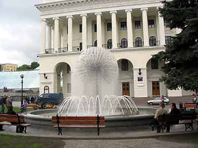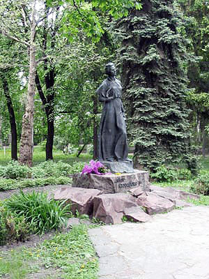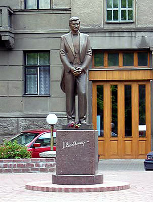 Киев. Перед входом в Андреевскую церковь можно увидеть персонажи экранизированной пьесы М. Старицкого «За двумя зайцами» — Проню Прокоповну и Свирида Петровича Голохвастова. Один из удачных примеров городской скульптуры.