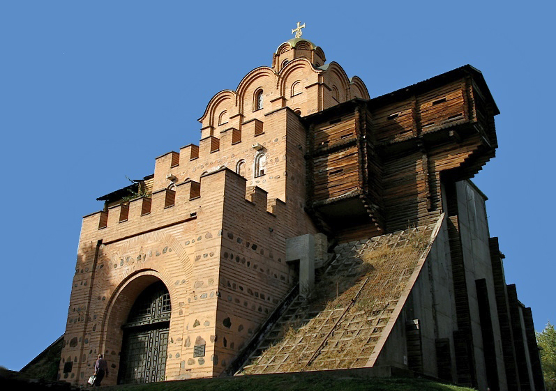 Киев. Золотые ворота Реконструкция. Возведены между 1019 и 1024, свое завершение получили в 1164. Служили главным входом в Киев с юго-запада, были обращены к византийскому Константинополю. По замыслу составляли единую композицию с Софийским собором. Представляли собой башню, прямоугольную в плане, с вытянутой стороной, ориентированную по оси проезда. На втором ярусе была расположена надвратная церковь Благовещения. В 19 в. Золотые ворота, потеряв оборонительное значение, были разрушены.
