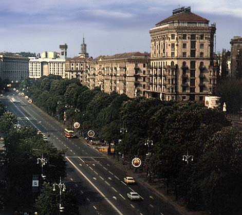 Крещатик. В годы Великой Отечественной войны главная улица Киева была практически разрушена. В 1947-1954 гг. по проекту архитекторов А. В. Власова, А. В. Добровольского, В. Д. Елизарова, Б. И. Приймака, А. И. Малиновского был создан новый архитектурный ансамбль Крещатика, но это был уже другой Крещатик.