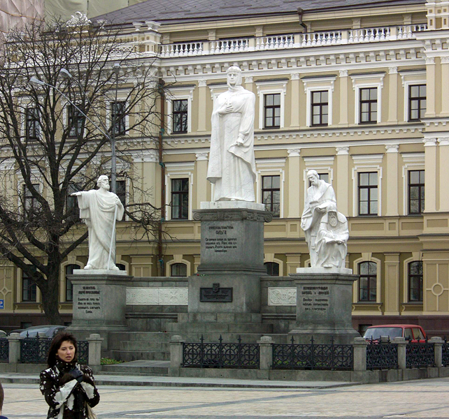 Киев. Памятник княгине Ольге. Слева — скульптура апостола Андрея Первозванного, справа — скульптуры Кирилла и Мефодия. Возведен в 1911, в 1919-1923 разрушен. Восстановлен в 1996.