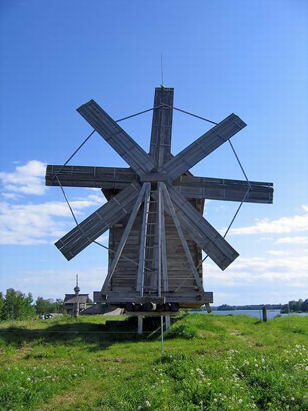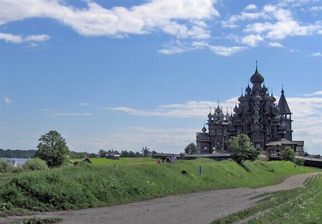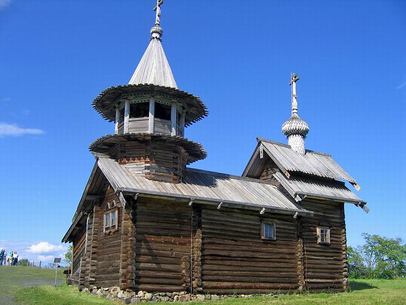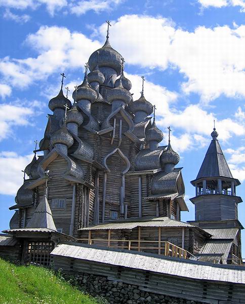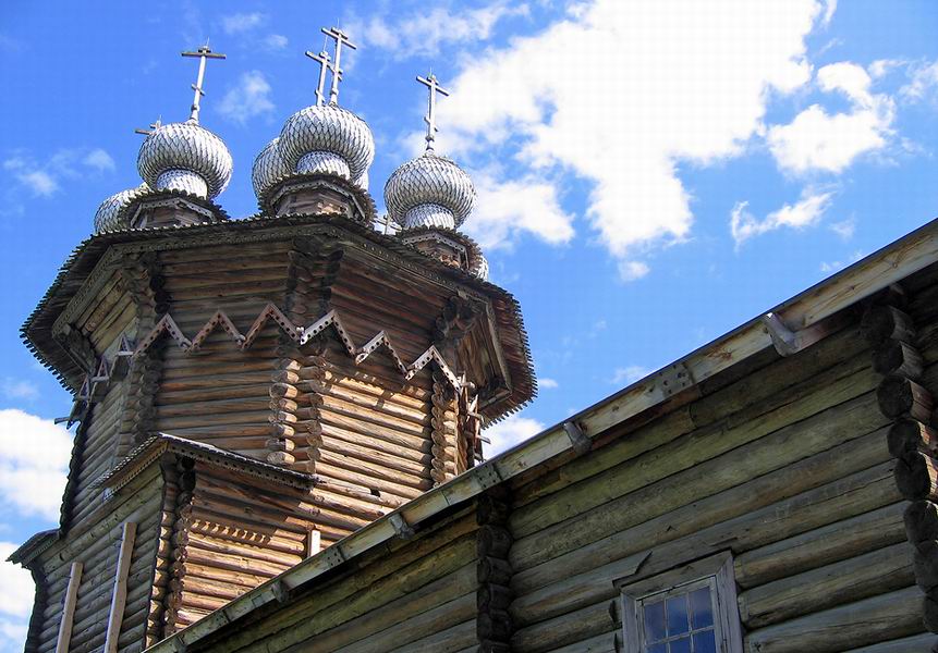 Церковь Преображения Господня. 1714. Cамое знаменитое и выдающееся сооружение ансамбля, памятник федерального значения, памятник культурного наследия РФ (особо ценный объект). Предшественником считается Церковь Покрова Пресвятой Богородицы (1708) в Вологодской области. Настоящие имена создателей церкви неизвестны. Высота церкви — 37 метров. Церковь построена в традициях русского плотничьего ремесла — без гвоздей (за исключением «чешуек» на лемехах куполов). По типу-храм «летний», зимой в нем службу не проводят. Церковь увенчана 22 главами, размещенными ярусами на кровлях прирубов и восьмериков, имеющих криволинейную форму типа «бочки». Форма и размеры глав меняются по ярусам, что придает своеобразный ритмический рисунок облику церкви. Трапезная перекрыта трехскатной крышей. Вход в церковь выполнен в форме двухвсходного крытого крыльца на консолях. Иконостас — четырехъярусный, составлен из 102 икон. Фото И.В.Мерзликиной.