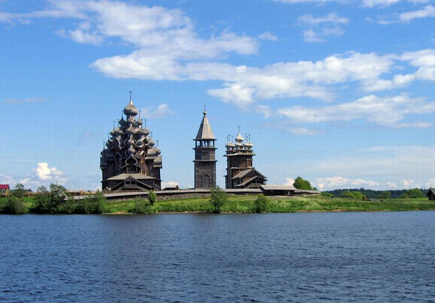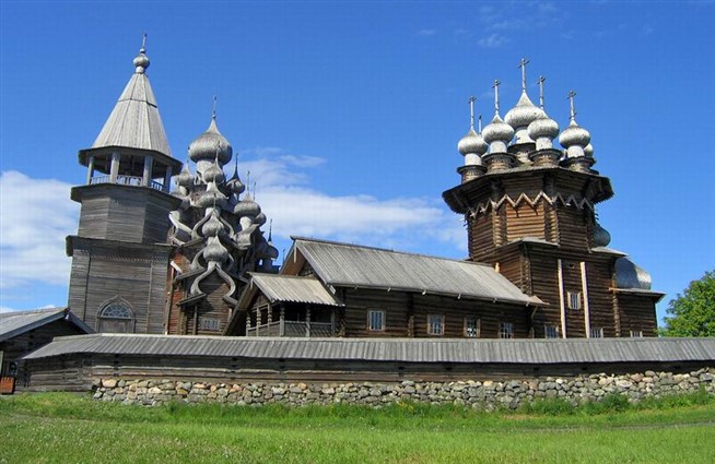 Кижский погост-центр музея смысловой и композиционный. Создан здесь в 18-19 вв. Включает: единственную в мире деревянную 22-главую летнюю Преображенскую церковь (1714), десятиглавую зимнюю Покровскую (1764), шатровую колокольню (1862 –1874), рубленую бревенчатую ограду (каменное основание – 1800, реконструкция сруба – 1959).Фото И.В. Мерзликиной.