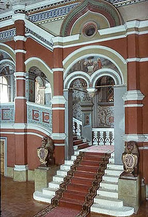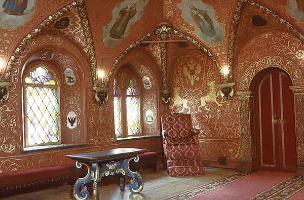 Теремной дворец. На третьем этаже дворца находились личные покои царя. Анфилада комнат этого этажа заканчивалась Спальней, в которой стояла золоченая резная кровать с балдахином.