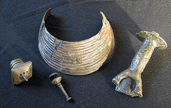 Предметы из датских могильников: гривна, навершие и рукоять кинжала, заклепка. Бронза. Эпоха поздней бронзы. 14-12 вв. до н.э.