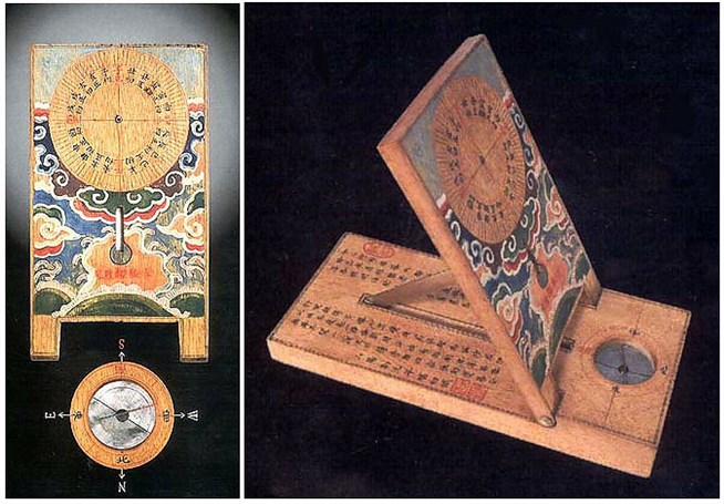 Китайские путевые солнечные часы. Совмещены с компасом. Верхний циферблат часов использовался предположительно в летний период, нижний — в зимний. При помощи компасной стрелки инструмент ориентировали в направлении север-юг. Китай, эпоха Чжоу. 11 в. до н.э.