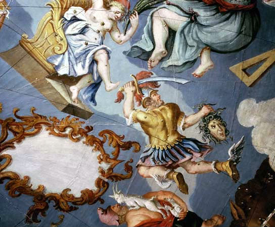 Фрагмент росписи Большого Академического (Готторпского) глобуса-планетария, созданного в 1654-1664 гг. под руководством А. Оленария в Готторпском замке, резиденции герцога Голштинии; подарен Петру I во время Северной войны. Глобус сильно пострадал при пожаре 1747; полностью восстановлен в 1748-1799 гг. Внутри глобуса — столешница с вмонтированными в нее календарем и скамьями, на которых одновременно могли разместиться до 12 человек. Диаметр 3, 1 м; вес 3, 5 т.