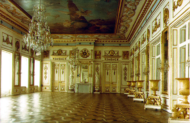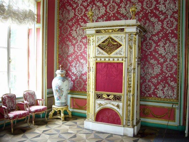 Малиновая гостиная — одна из самых парадных комнат дворца. Получила свое название по цвету обивки стен и мебели. В ее художественном убранстве соединены элементы различных стилей 18 в. — барокко, рококо и классицизма.