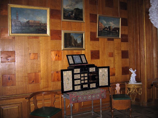Кабинет-конторочка. Предназначен для деловых приемов, дубовая обшивка стен с врезанными живописными картинками воссоздает тип голландского интерьера. Первоначальное убранство было изменено в соответствии с новой модой в конце 18 в. Наибольший интерес представляют редкие образцы мебели: кресла с наугольными спинками русской работы 1-ой половины 18 в., итальянский настольный кабинет конца 17 в. с венецианским золотым и серебряным шитьем, немецкие напольные часы с забавными механизмами и ранний образец «архитектурных» печей.