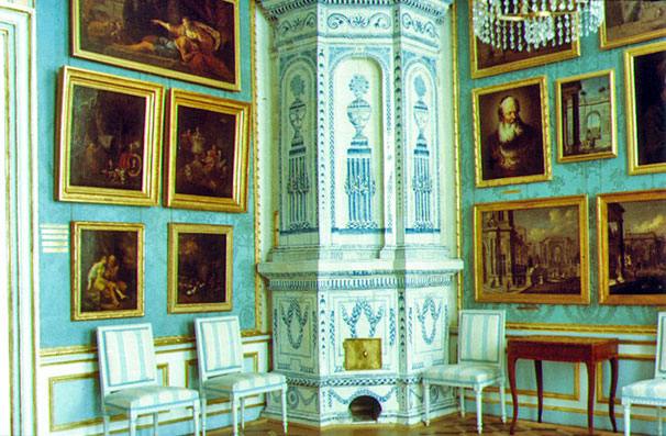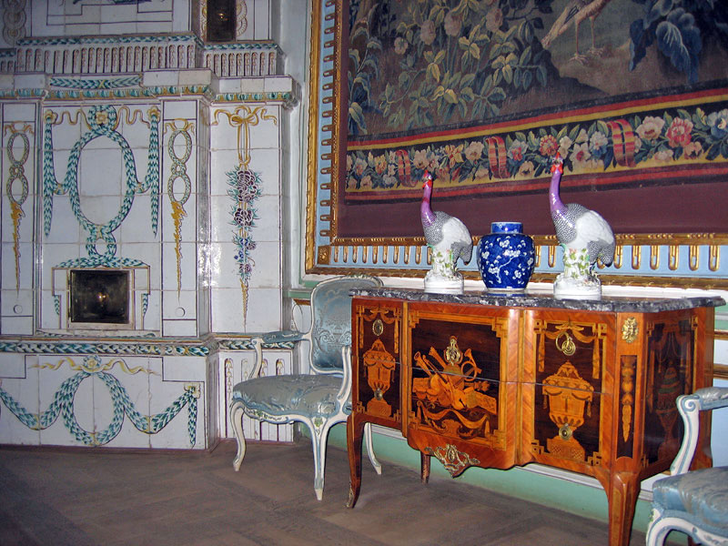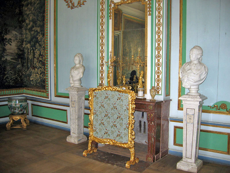 Первая гостиная. Ее убранство раскрывает основные принципы и элементы художественного оформления дворцовых интерьеров 2-ой половины 18 в. Стены украшены коврами-шпалерами, строго окаймленными золочеными рамами. Камин с пышным экраном и печь с многоцветными изразцами демонстрируют европейскую моду и русские традиции. Над камином и дверьми расположены живописные панно-«десюдепорты» работы русских и иностранных художников. Зеркала в резных золоченых рамах зрительно увеличивают пространство, служат дополнительным освещением зала. Разнообразная по назначению мебель расставлена строго вдоль стен, оставляя центр интерьера свободным для гостей. Полотна итальянских мастеров середины 18 в, китайские напольные вазы, тканый портрет императрицы Екатерины II, выполненный в 1766 на Петербургской шпалерной фабрике Василием Фирсовым, подписан мастером.