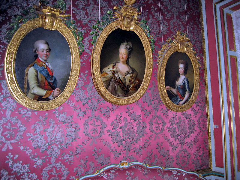 Портреты Малиновой гостиной. Официальную значимость зала определяют парадные портреты русских императорских особ — Елизаветы Петровны (неизв. русский художник Ной второй половины 18 в.), Екатерины II работы выдающегося русского портретиста Ф. С. Рокотова, Великого князя Павла Петровича и Великой княгини Марии Федоровны кисти Д. Г. Левицкого. Фамильную принадлежность Дворца подчеркивают пышный парадный портрет «государственного мужа» — хозяина дома П. Шереметева, написанный французским художником Н. Б. Делапьером, и парные скульптурные бюсты родителей — фельдмаршала Бориса Петровича и его жены, выполненные Ф.Шубиным.