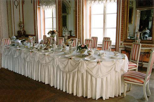 Парадная столовая. Предназначалась для торжественных обедов избранных гостей, перед которыми, с одной стороны, раскрывался вид на домовую церковь Спаса, с другой — вид на Большой пруд усадьбы и всю анфиладу парадных залов. Каждый элемент художественного оформления служит напоминанием о доблести и значимости рода Шереметевых. Расписная декоративная ниша в виде беседки, увитой гроздьями винограда, и буфетная горка — своеобразный пьедестал для мраморного бюста Александра Македонского — ассоциативно связаны с военными подвигами первого русского фельдмаршала Бориса Шереметева. Декоративный плафон французского живописца Ш. Лотреца «Триумф Юноны» прославлял сказочное богатство рода. Фамильные парные портреты родителей хозяев дома — графа и графини Шереметевых и князей Черкасских кисти русского художника Ивана Аргунова — образцы парадной живописи, одновременно являются неотъемлемой частью художественного оформления Дворца.