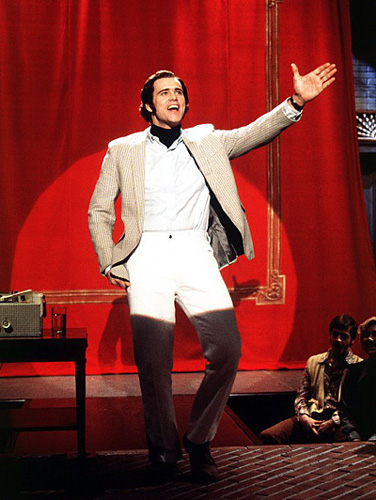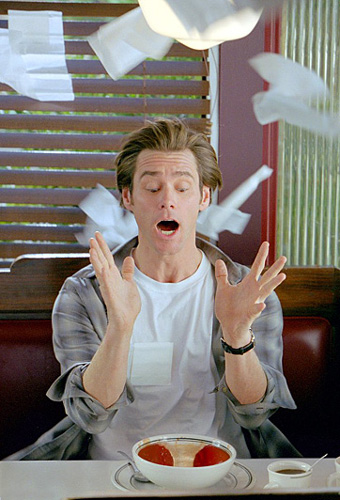 Джим Керри в фильме "Эйс Вентура: Розыск домашних животных". 1994 год. Архив редакции "Видео-АСС".